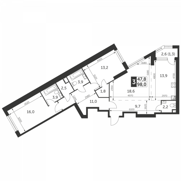 3 комнаты, 98 м², Этаж: 24/47, № 1328
