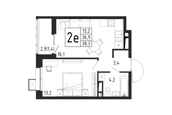2 комнаты, евроформат, 38.3 м², Этаж: 8/10, № 231