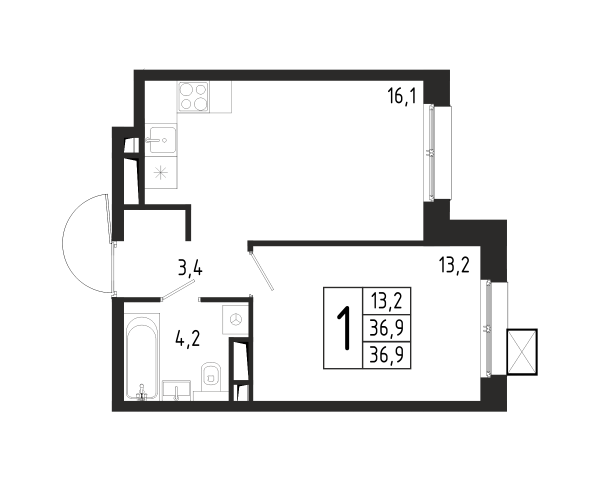 2 комнаты, евроформат, 36.9 м², Этаж: 1/10, № 8