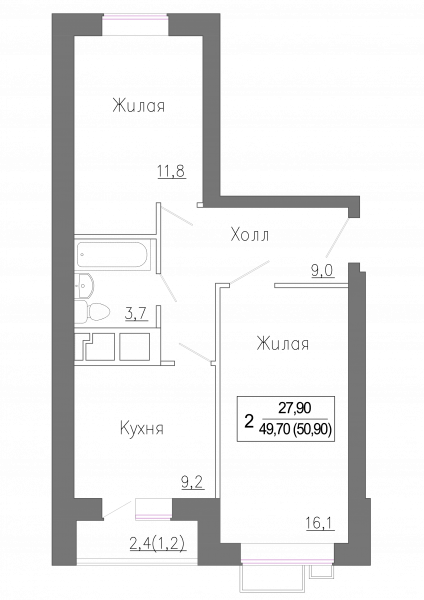 2 комнаты, 50.9 м², Этаж: 4/4, № 10178367