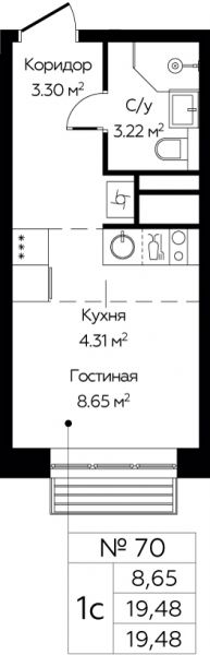 Студия, 19.48 м², Этаж: 8/22, № 70