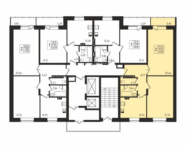 В доме представлены одно- и двухкомнатные квартиры площадью от 38 до 70 м2. Высота потолков – 2,8 м.