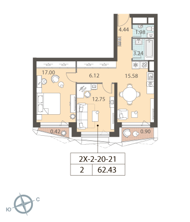 2 комнаты, 62.43 м², Этаж: 20/22, № 137569