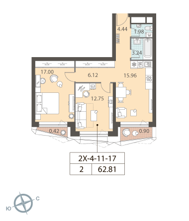 2 комнаты, 62.81 м², Этаж: 13/22, № 137615